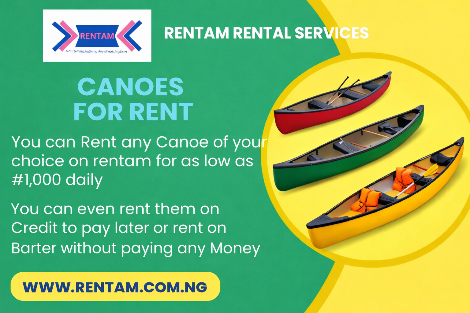 Rent Canoes anywhere in Nigeria via Rentam Rental Services. Affordable daily and long-term canoe rentals for fishing, transportation, tourism, recreation, and water activities. Book online now!